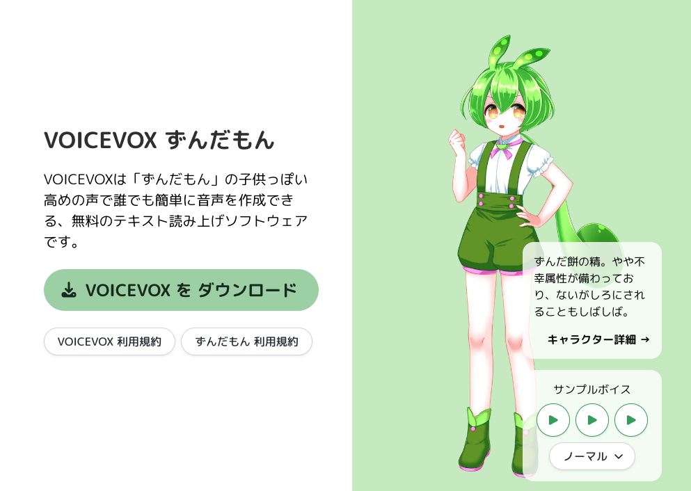- ポイント:日本語特化の音声合成ツールで、「ずんだもん」などのキャラクター音声を無料で使える。ただし2026年現在、同一キャラ音声の量産型動画は収益化リスクが高まっているため、演出や構成に独自性を出すことが重要