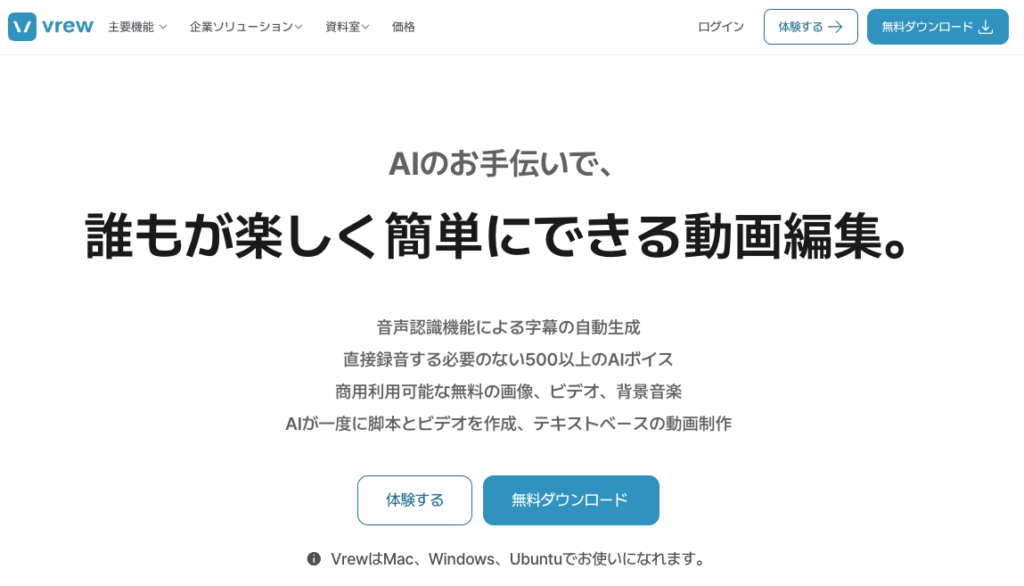 - 用途:字幕の自動生成・AI音声ナレーション追加・テキストベースの動画編集