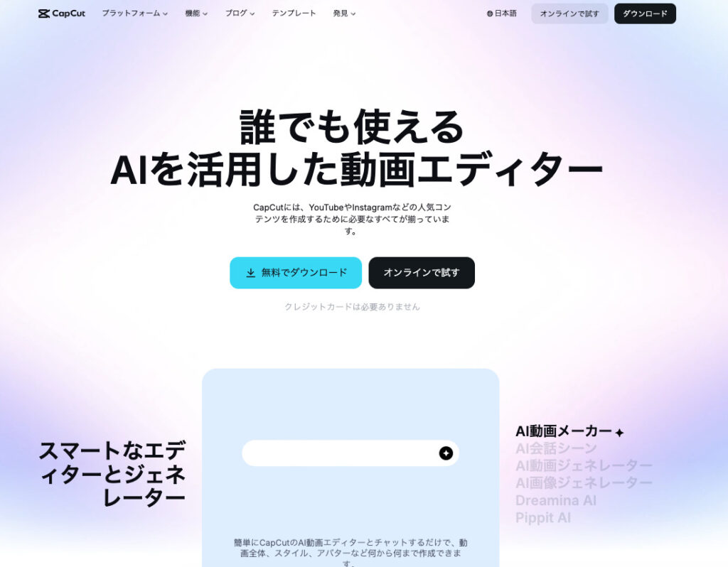 - ポイント:スマホ・PCどちらでも使えるシンプルな動画編集アプリ。ショート動画のテンプレートが豊富で、AIによる自動字幕生成にも対応している。商用利用の規約は定期的に変更されるため、最新の利用規約を確認してから使用すること