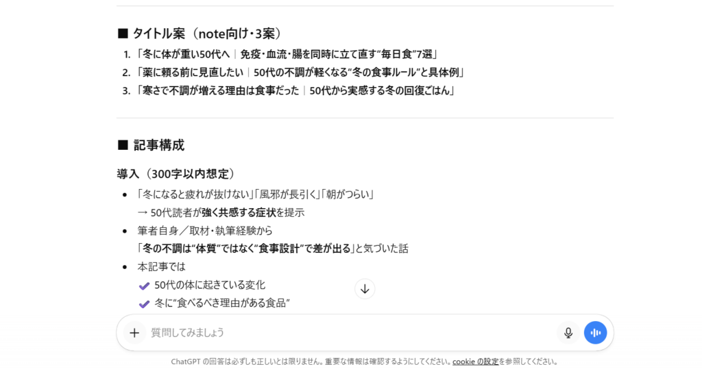 実際に【記事テーマ】健康にいい冬におすすめの食事、【想定読者】健康に悩む50代男女を例にChatGPTに生成してもらいました。