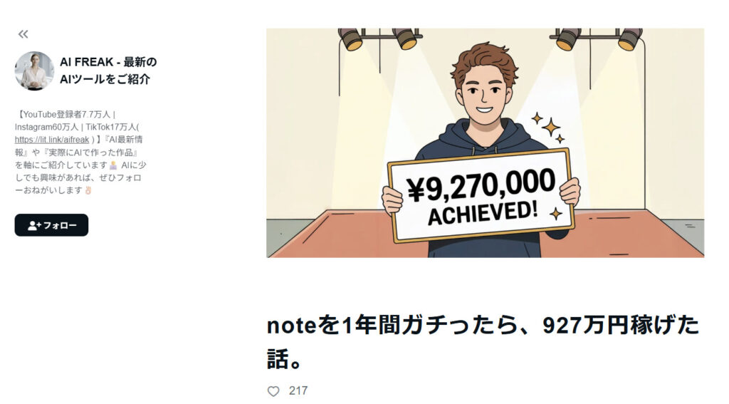 AI FREAKさんは、AIツールを活用した情報発信を軸にnoteへ本格参入し、約10か月で累計927万円を達成しています。特別なスキルを売るというより、実際に使って分かったことやどう使うと仕事が楽になるかといった実用性を重視した内容です。