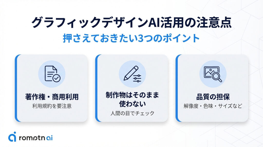 グラフィックデザインAIを実務で活用する際は、いくつかの注意点があります。特に著作権と品質管理は、トラブルを避けるために必ず確認すべき項目です。