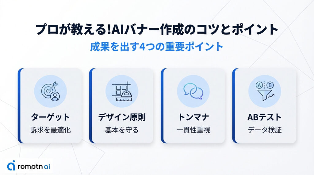 バナーの効果を最大化するには、ターゲット設定、デザイン原則、トンマナの統一、A/Bテストの4つが重要です。