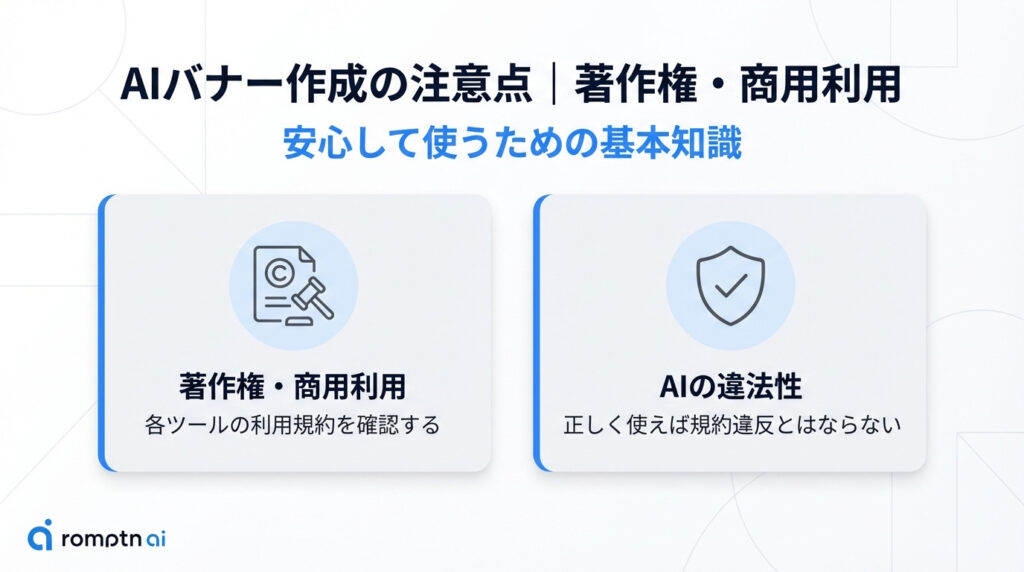 AIバナー作成では、著作権と商用利用のルールを正しく理解することが不可欠です。法的トラブルを避けるため、ツールごとの利用規約を必ず確認してください。