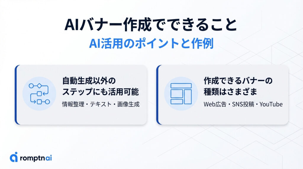 「AIでバナー作成」と聞くと上記のように自動生成してくれるイメージが湧くかもしれませんが、実はさまざまなステップで活用できます。