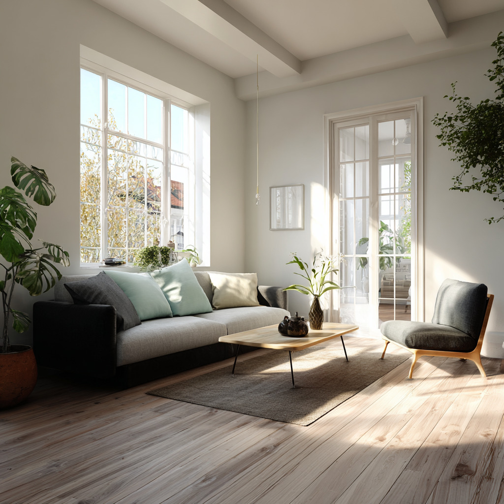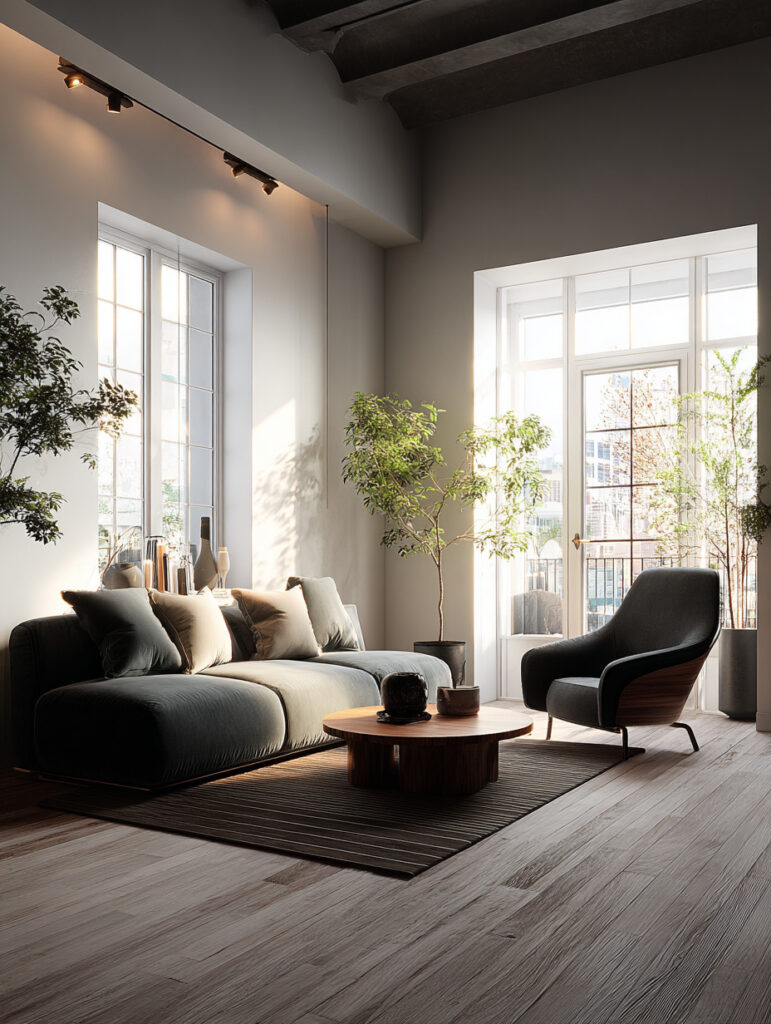 chic modern living room, hotel-like interior, charcoal and warm gray color palette, matte black metal accents, walnut wood, low-contrast soft lighting, minimal decor, refined and calm atmosphere, keep the same composition and camera angle, photorealistic, high-end interior design --style raw --iw 1.6