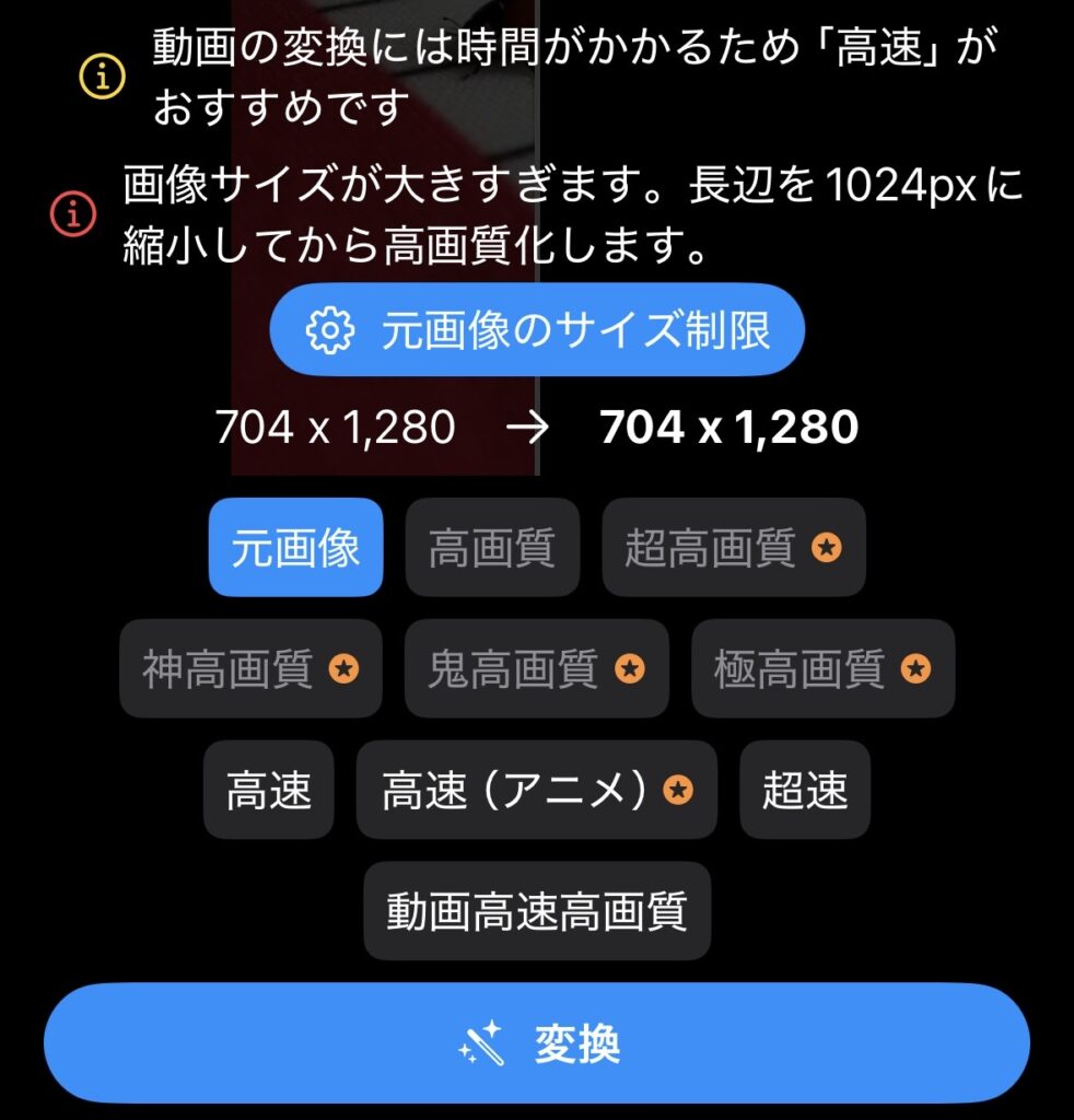とにかくワンタップで簡単に高画質化したいかんたん高画質化モード選択だけで進めやすい(サイズ制限や広告・課金条件は要確認)