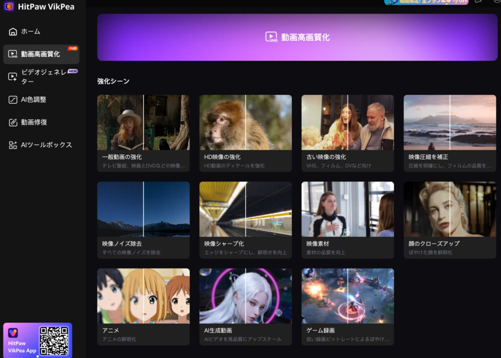 旧「HitPaw Video Enhancer」から名称変更され、AIモデルの種類や処理精度が強化されています。