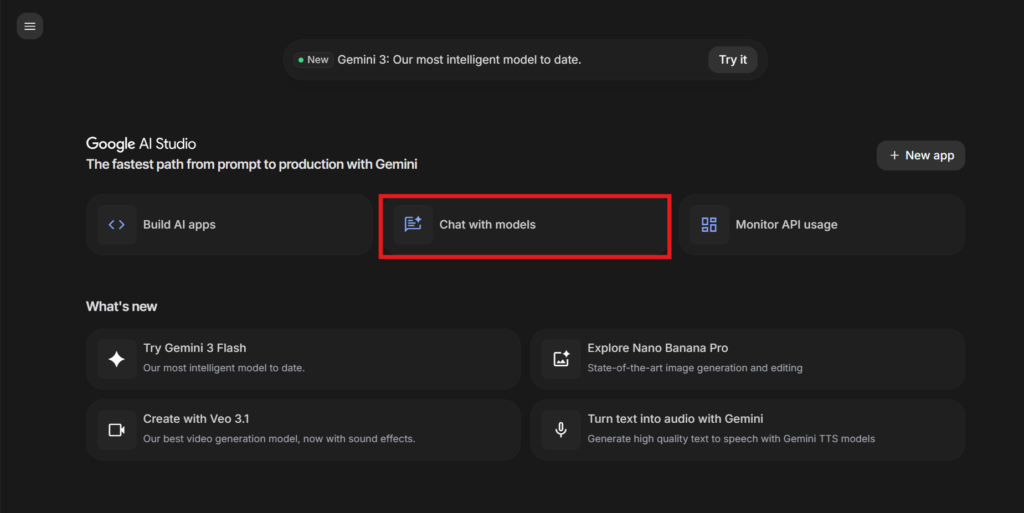 ホーム画面中央の「Chat with models」をクリックし、チャット画面を開きます。