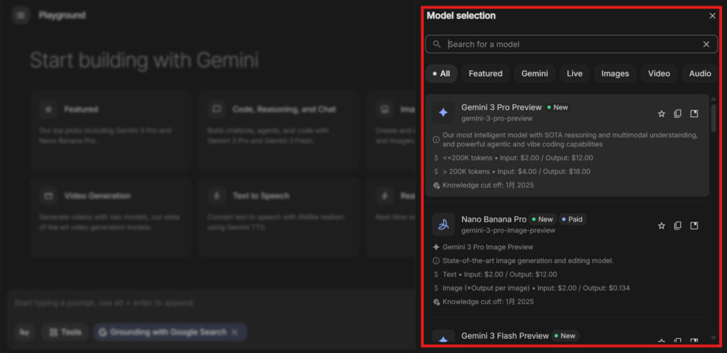 と思うかもしれませんが、実はそうとも言い切れません。AI Studioは「厨房」であるがゆえに、制限が少なく、高性能な素材(最新モデル)を無料で味見できるという大きなメリットがあるからです。
