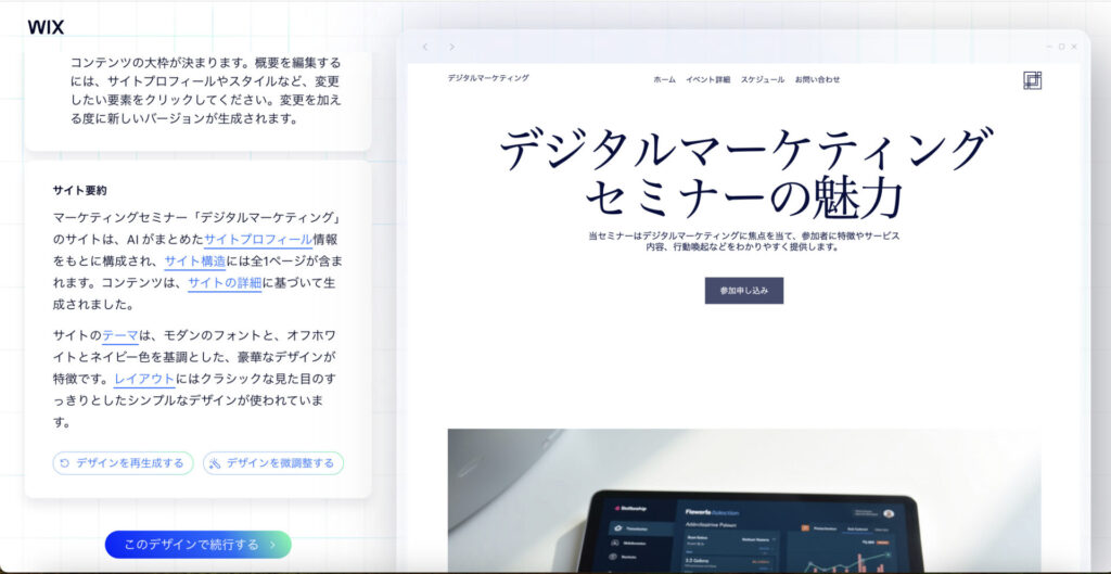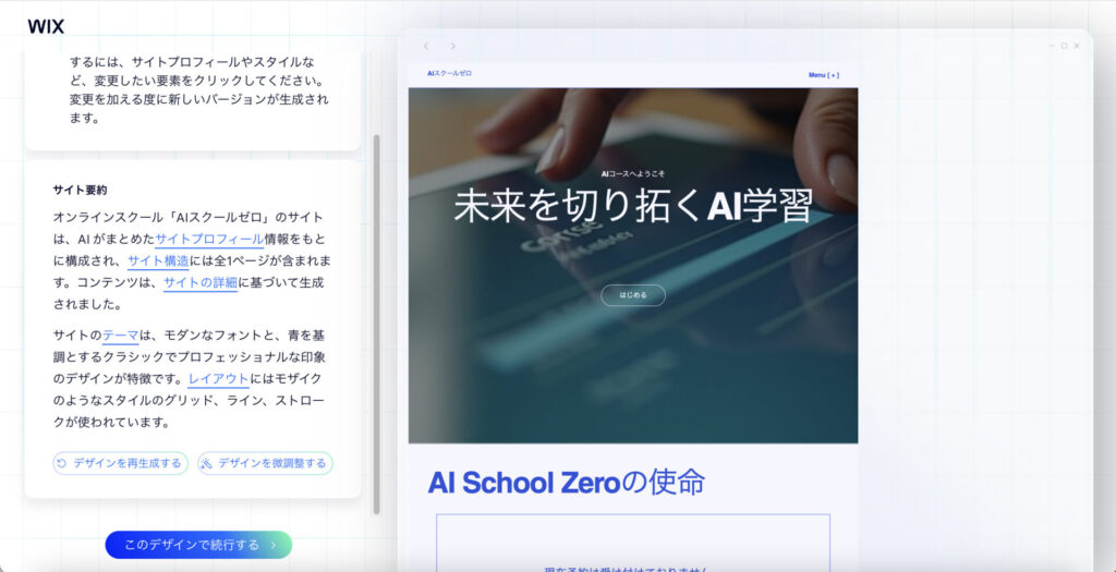 WixまたはJimdoに無料登録し、AI自動生成機能を起動します。「業種」「LP目的」「好みのデザインスタイル」などの質問に答えると、AIが自動的にLPの土台を生成してくれます。