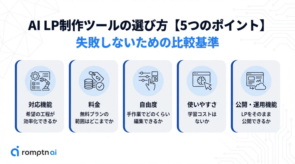 AI活用でLP制作を効率化するには、目的に合ったツールを選ぶことが重要です。ここでは、ツール選定で重視すべき5つのポイントを解説します。