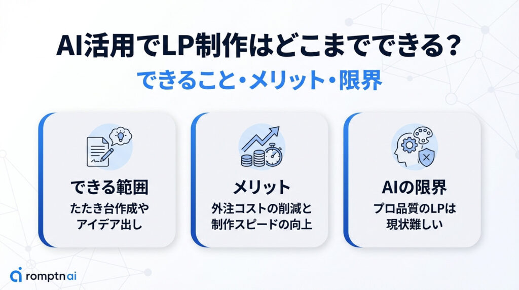 まずは、AIを活用したLP制作で実際に何ができるのか、そのメリットと限界について知っておきましょう。