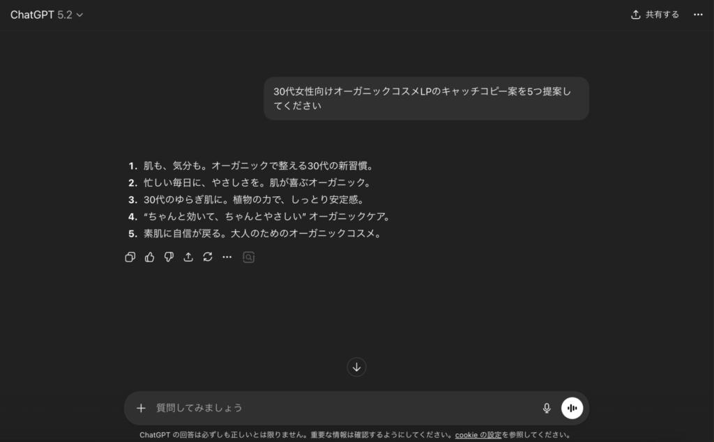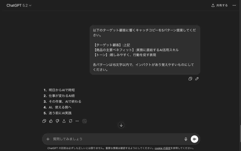 ChatGPTに「このキャッチコピーの別パターンを5つ提案してください」と依頼すれば、異なる訴求軸のコピー案が数秒で生成されます。これを叩き台として、マーケターが最終調整すれば、外注で追加費用を払わずにバリエーションを用意できます。