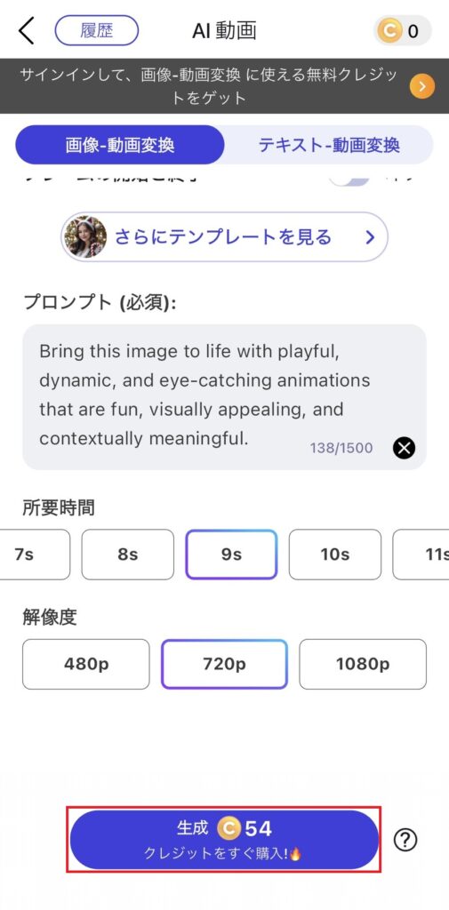 所要時間と解像度を設定して、「生成」を押す