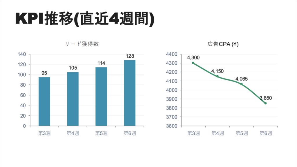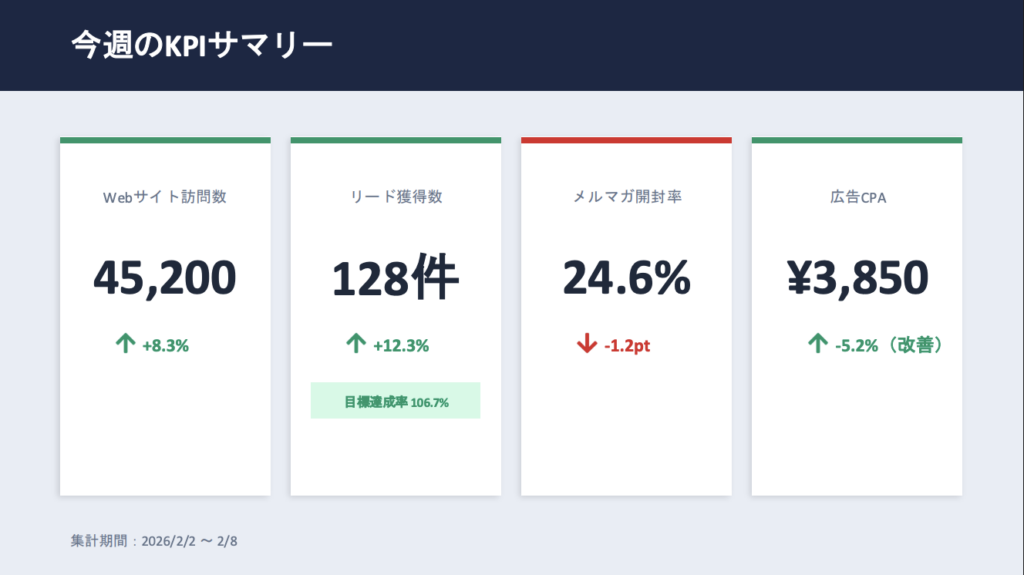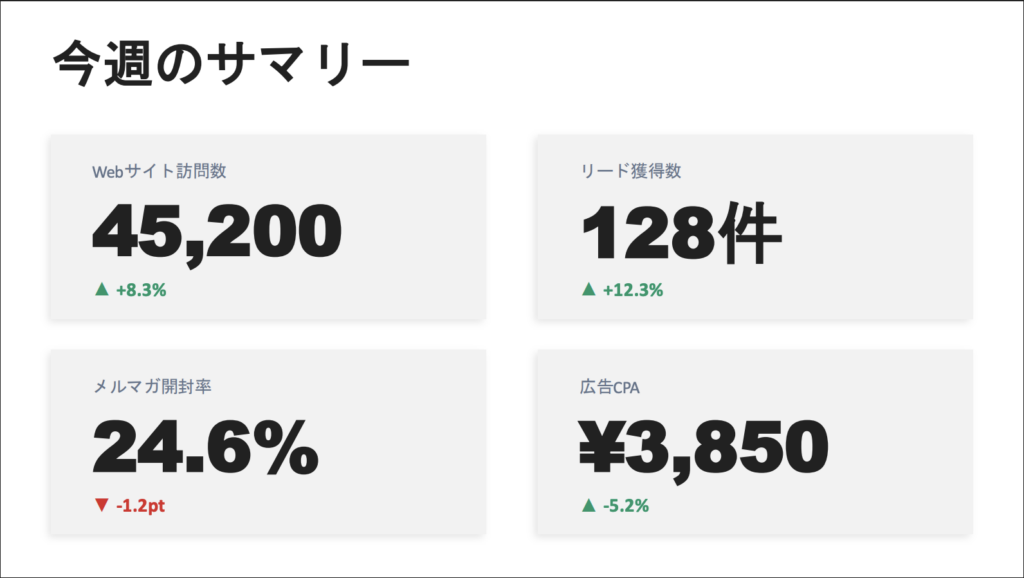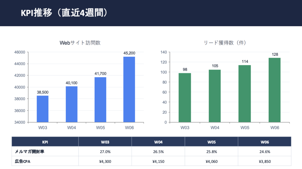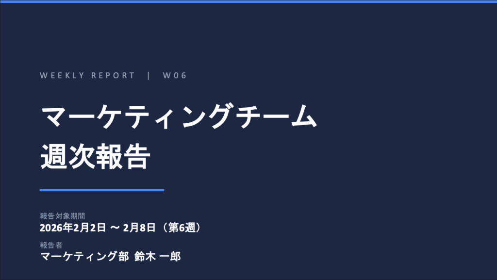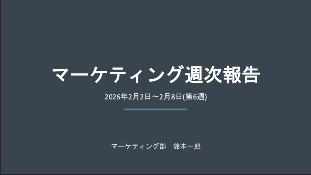 無料版は、先ほどの例の2つ目である「マーケティング週次報告」の資料を再び載せておきます。