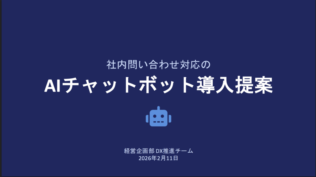 上記のように入力し、数分待った結果、以下のようなスライドが生成されました。