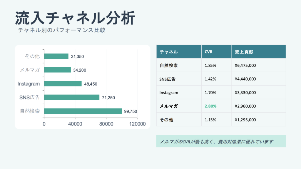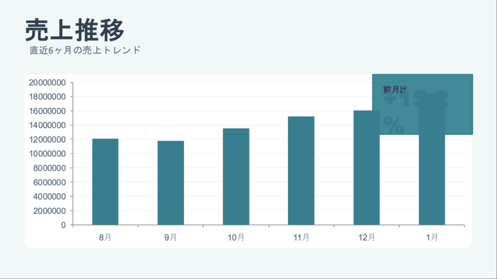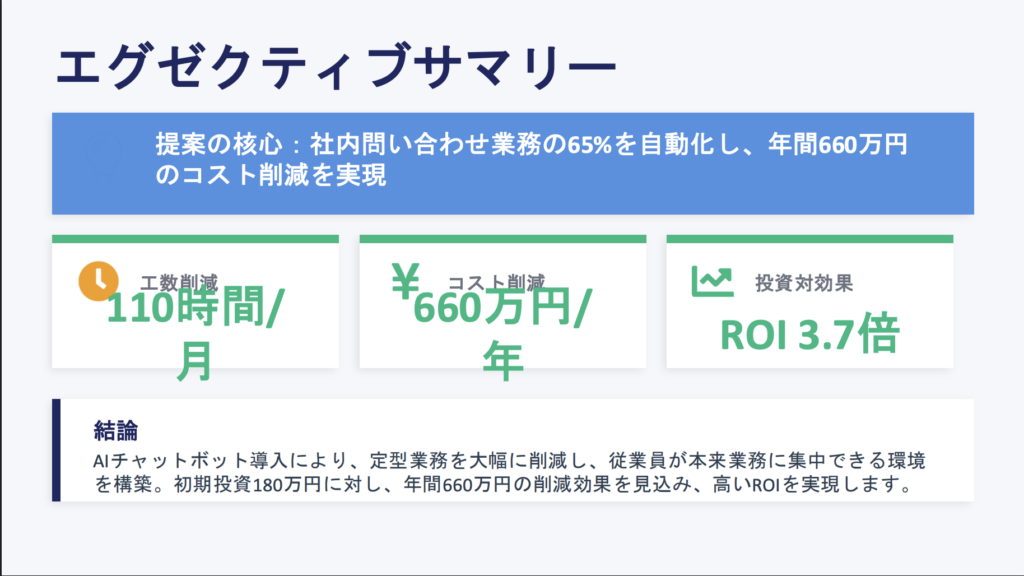 • レイアウトはスライドごとに変化をつけてください(2カラム、カード型、大きな数字の強調など)
