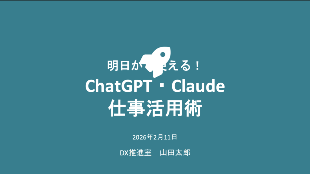 ここでは実際に、無料版のClaudeで5種類のパワポ資料を作成し、実際に使用したプロンプトと生成されたスライドを紹介します。