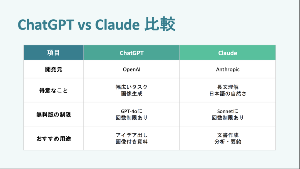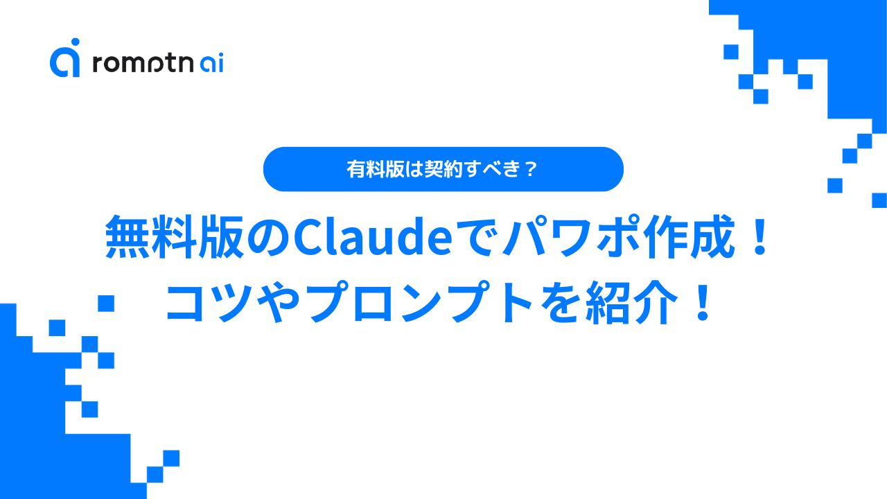 そこでこの記事ではClaudeの無料版でパワポ資料を作成するためのプロンプトやコツ、有料版との比較について解説します。