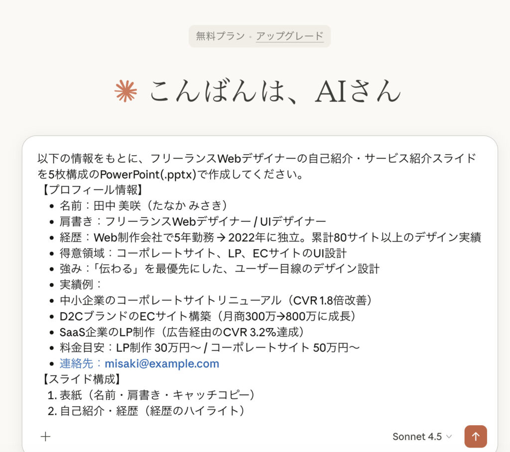 ・無料版Claudeでパワポ資料を作る際にはプロンプトの作り込みが重要