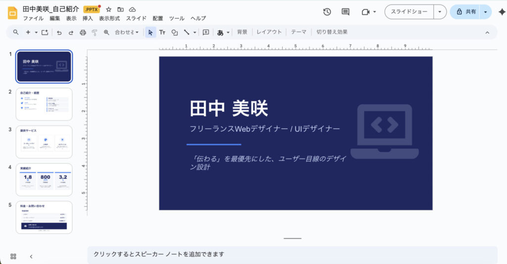 以下の情報をもとに、フリーランスWebデザイナーの自己紹介・サービス紹介スライドを5枚構成のPowerPoint(.pptx)で作成してください。