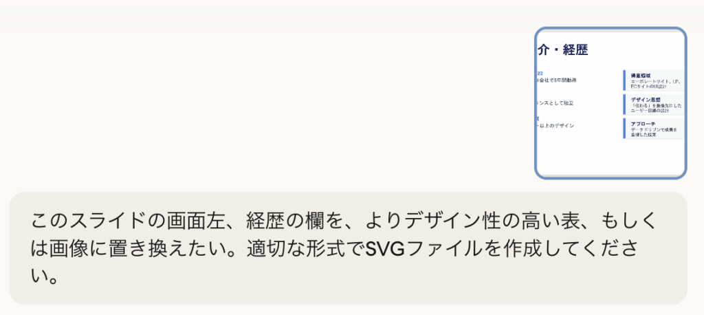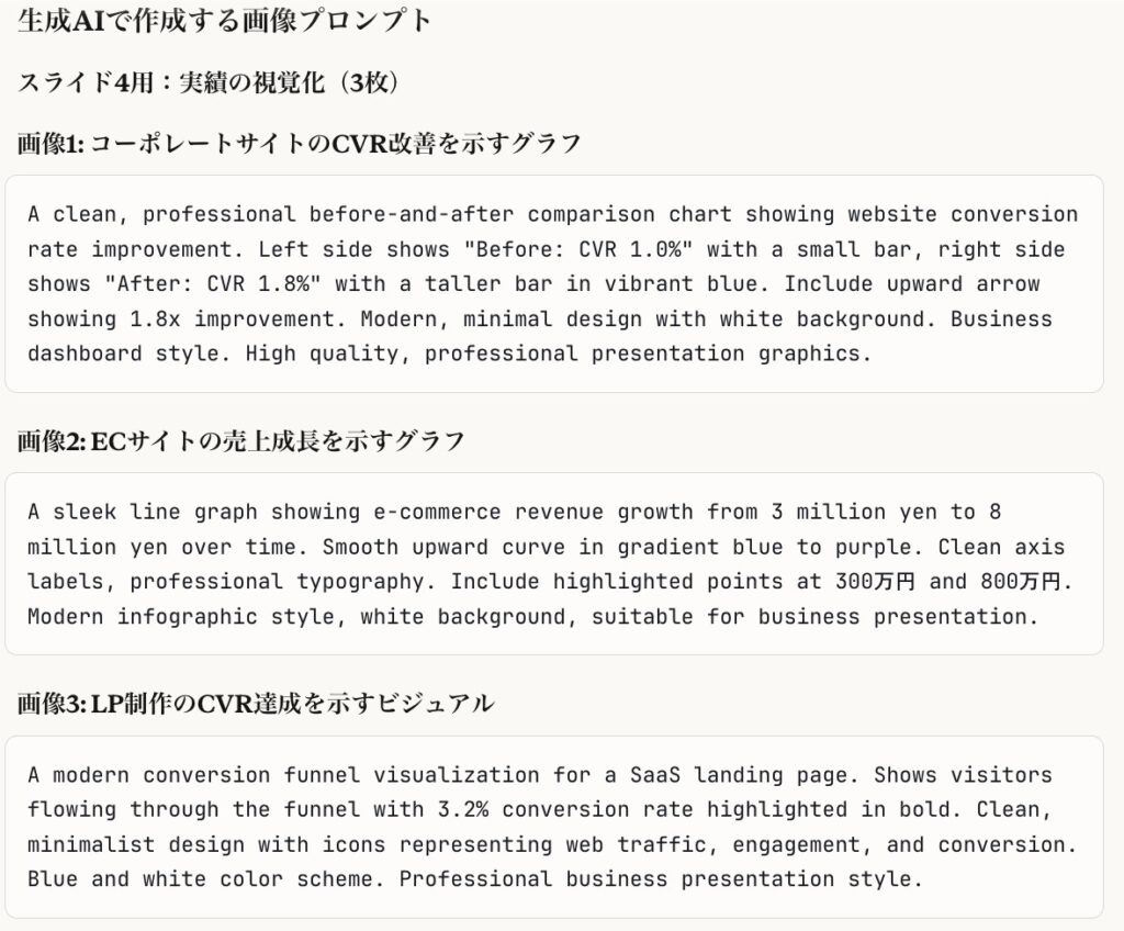 このようにして、スライド内で使用する画像やデザインのプロンプトをClaudeに出力させ、それを他生成AIで画像化することでスライドの質を上げることが可能です。