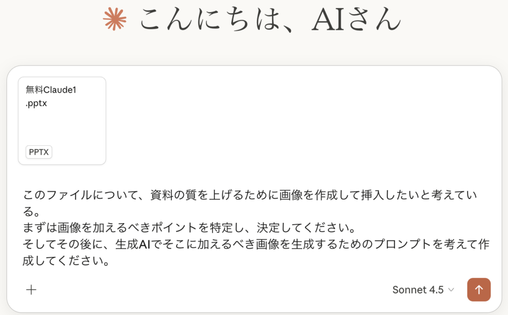 他の生成AIではモードの選択や特定のアプリ内でのみPowerPointの生成が可能であるということがありますが、Claudeでは通常通りのチャット欄に「PowerPoint資料を作成して」と入力するだけでスライドの生成が実行できます。