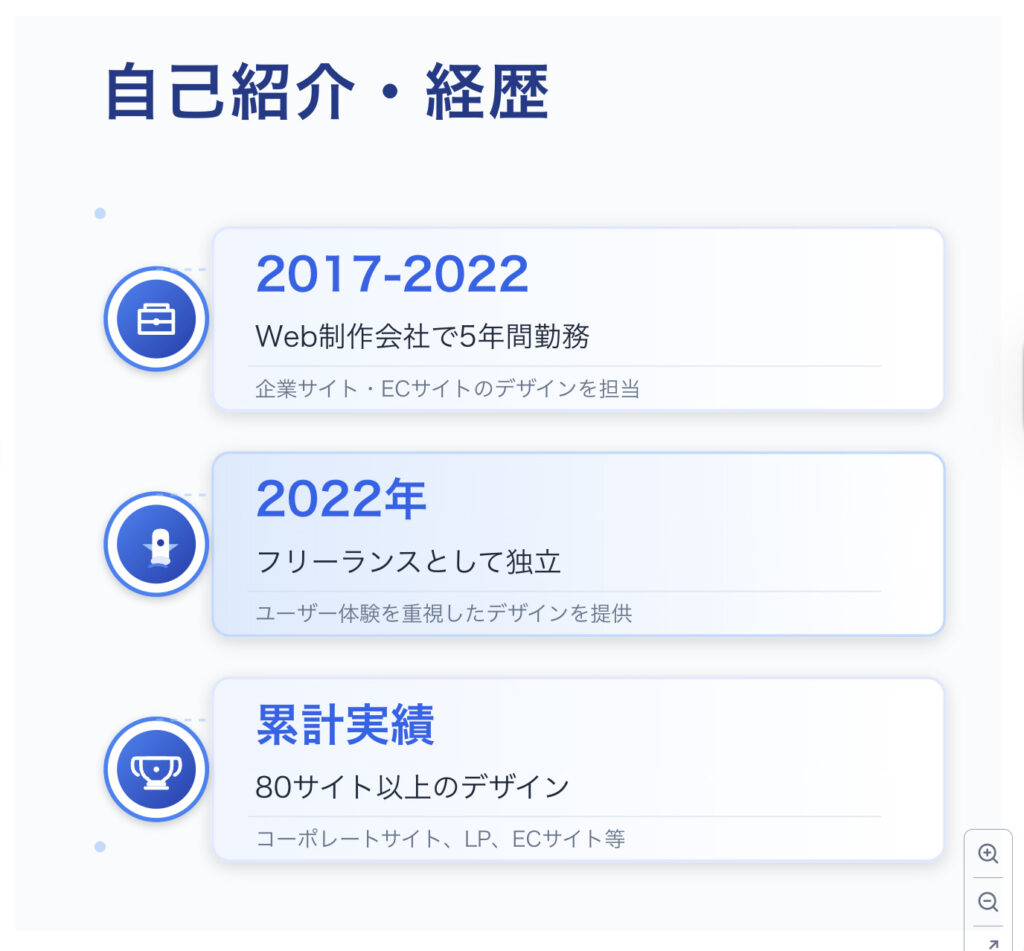 イチから作ると意外と面倒である自己紹介スライドを簡単に作成することができました。特に、記載したい内容を箇条書きで並べるだけで、その要素をスライドの構成に合わせて整理してくれる点は非常に便利です。