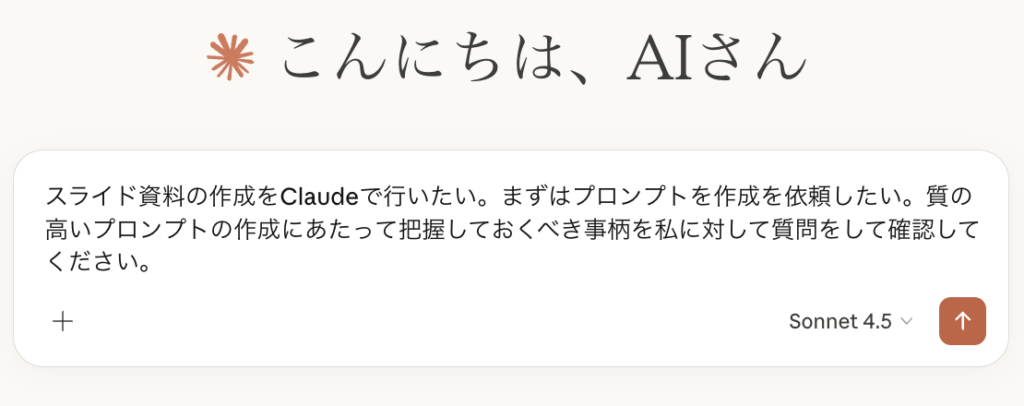 続いて、先ほど作成したプロンプトをClaudeのチャット欄に入力して、そのまま生成を実行します。