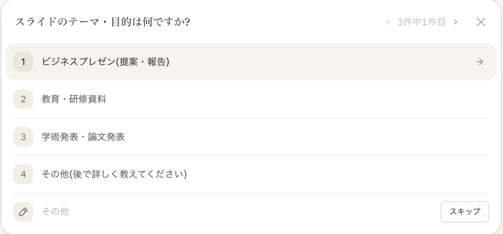 注意点として、パワポ資料の作成は大量のクレジットを消費するため、無料版では何回も修正を行うことが難しいです。そのため「これは条件に入れたい」という項目はプロンプトになるべく組み込むようにしておきましょう。