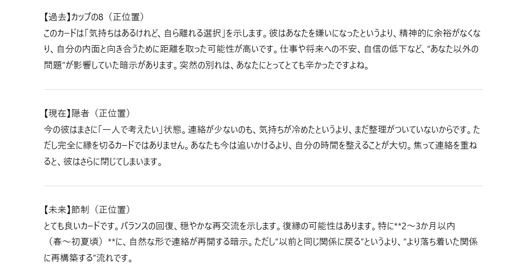 あなたはプロの恋愛占い師です。 以下の相談内容に対して、タロット3枚引き(過去・現在・未来)という設定で鑑定してください。 【相談者】 30代女性。3か月前に彼氏と別れました。 相手から「今は一人になりたい」と言われ、その後連絡はほとんどありません。 復縁の可能性と、今どう動けばいいか知りたいです。 【条件】 ・抽象論ではなく具体的に ・カード名も出す ・時期の目安を出す ・最後に前向きなアドバイスを入れる ・約800〜1000文字 ・感情に寄り添う口調で