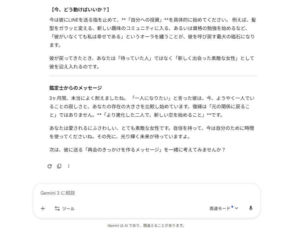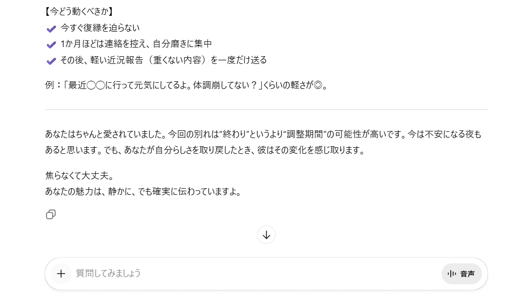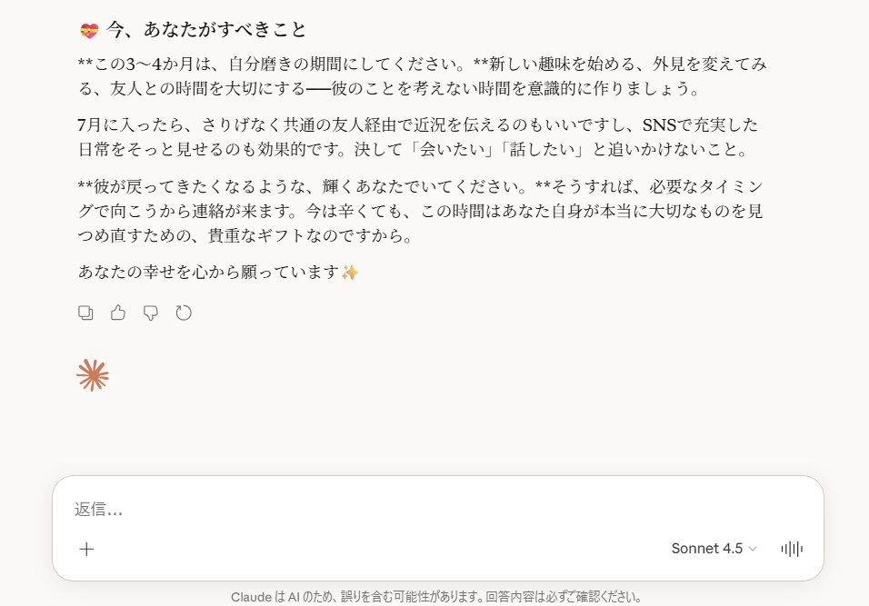 AI占い師の間で最も評価が高いのがClaudeです。特に、恋愛や復縁、不倫など感情が絡むテーマで強さを発揮します。文章の自然さ、共感の深さ、余白の作り方が非常にうまく、「人間が書いたような鑑定文」に仕上げやすいのが特徴です。