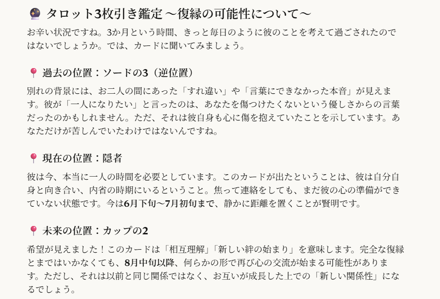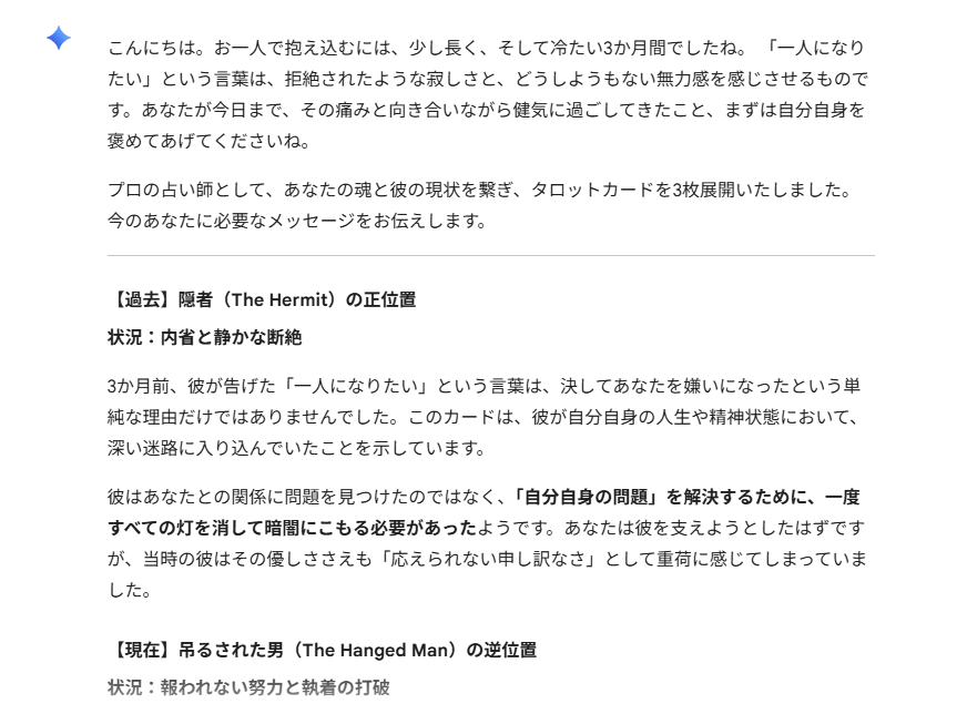 Geminiはそうした周辺作業を効率化する力が強いです。例えば、タロットカードの画像を読み取らせ、そのカードの意味を解釈し、相談内容に当てはめて文章化するといった使い方ができます。