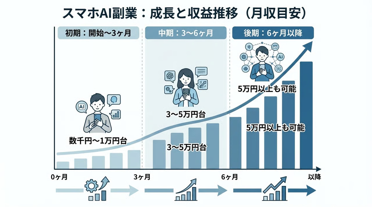 スマホだけのAI副業の収入は、段階的に伸びていくイメージです。