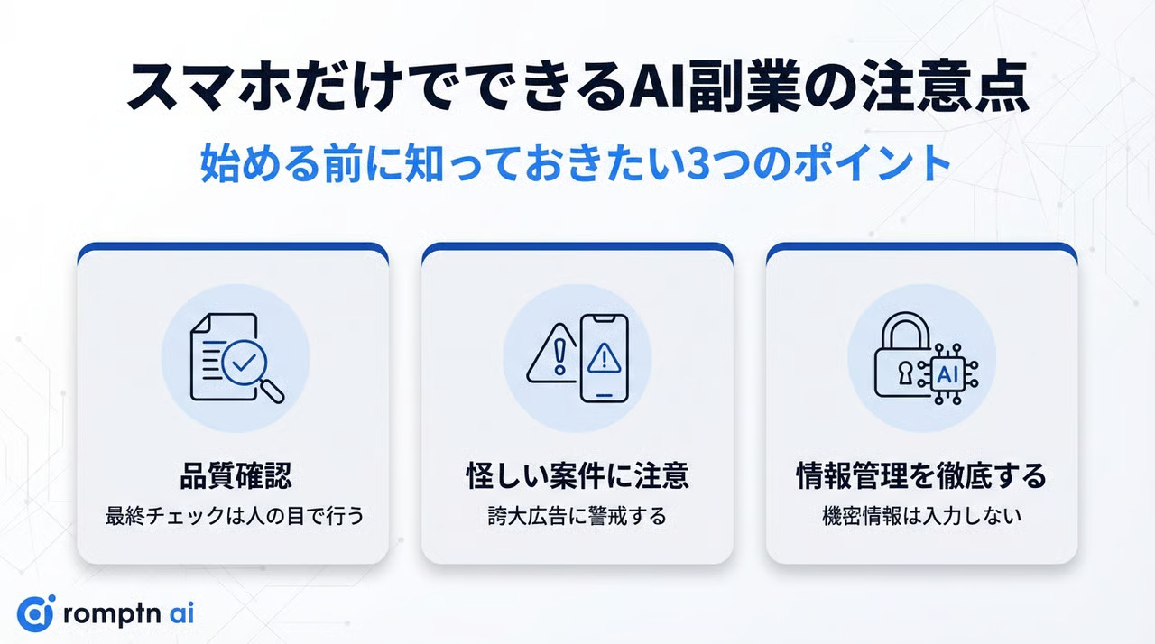 スマホだけで始められるAI副業は手軽さが魅力ですが、注意点もあります。
