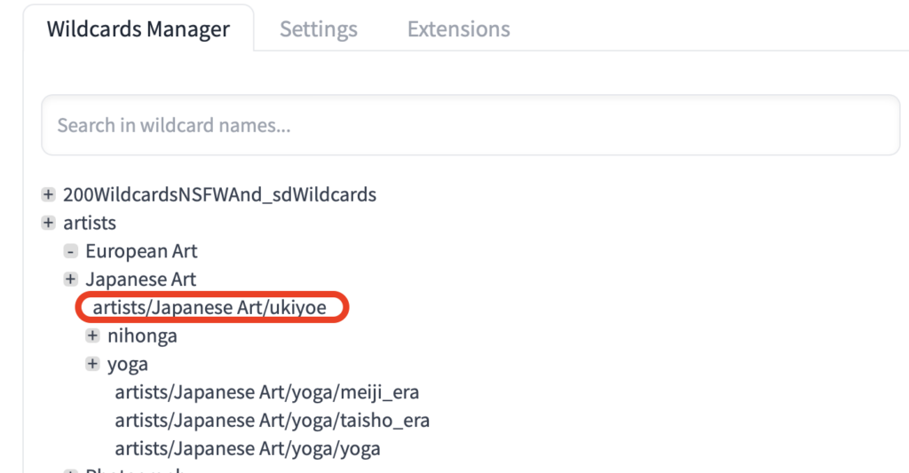 このartistsを開いていくとartists/Japanese Art/ukiyoeのワイルドカードがあるのでこれを使って画像を生成していきます。