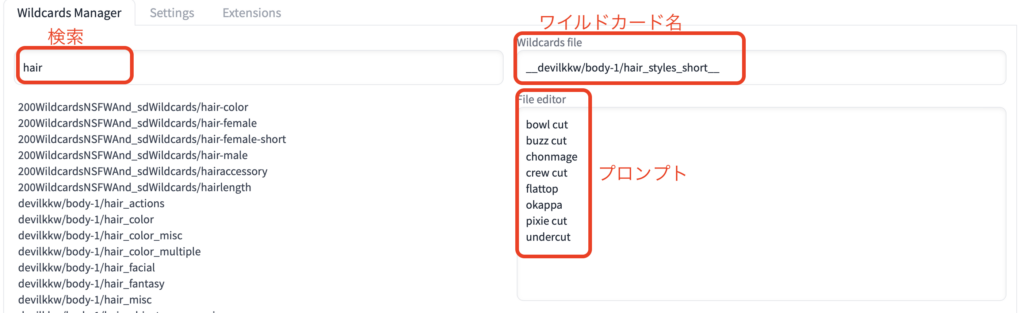 Wildcards Managerを使うと、ワイルドカードの中から必要なものを探したり、ワイルドカードを編集することができます。