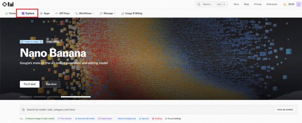 まずは、fal.aiの公式サイトにログインして「Explore」を開きましょう。