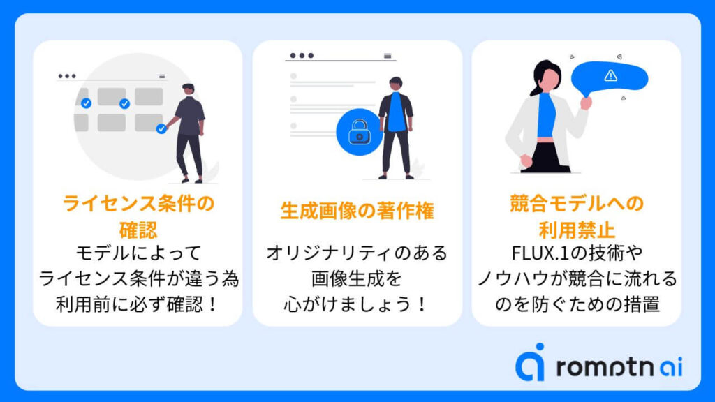 FLUX.1を商用利用する際には、以下の点に注意が必要です。