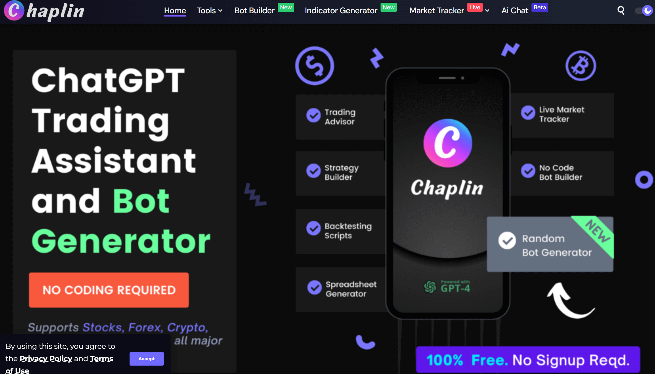 Chaplinは、トレーダーがコードを書かずに指標を構築し、戦略をバックテストし、高度な取引ボットを起動できるAIツールです。